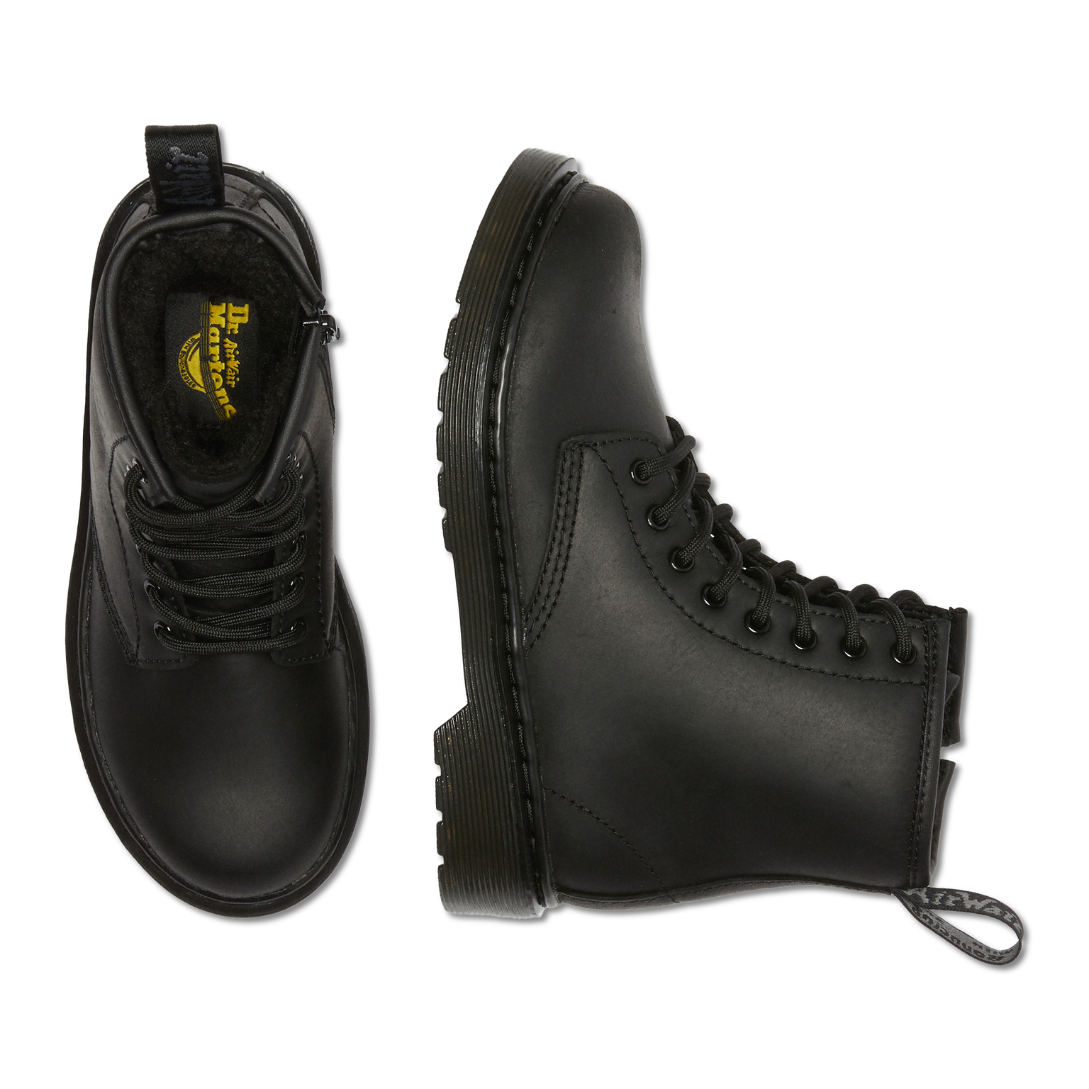 Dr. Martens 1460 T Black Serena Mono boots are perfect for the rebels of tomorrow. Keep their feet stylish and comfortable with these leather boots featuring lace-up fronts and a convenient side zip. With black stitching, a smoke-colored sole, and a black heel loop, they're ready for any adventure your child wants to embark on. The fur makes them perfect for colder months. Available for preschoolers up to teens. Pick up at our physical store in Copenhagen.